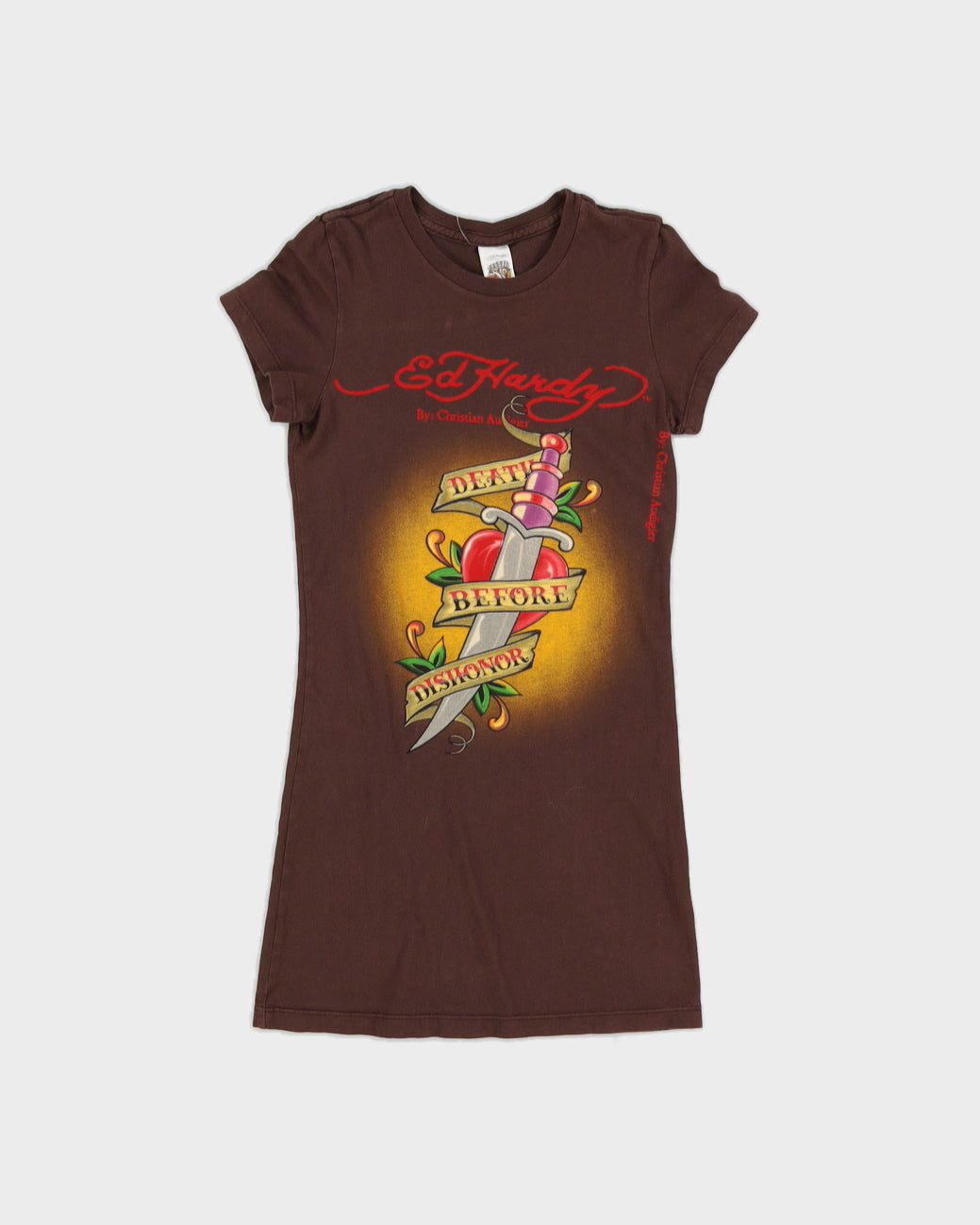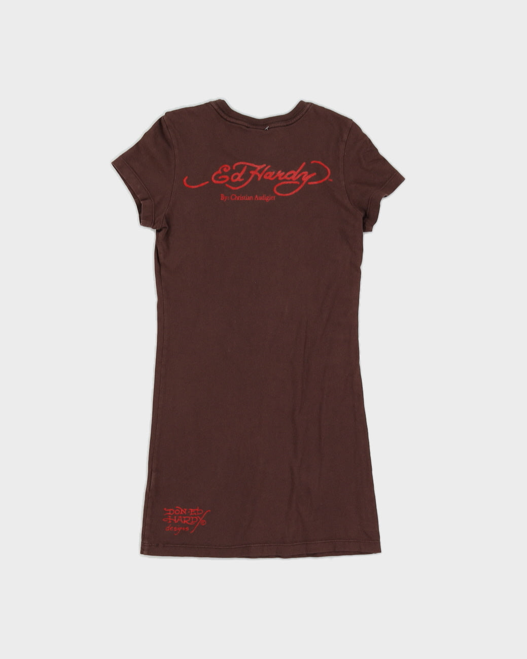 00s Y2K Ed Hardy Brown T-Shirt With Graphic - S
