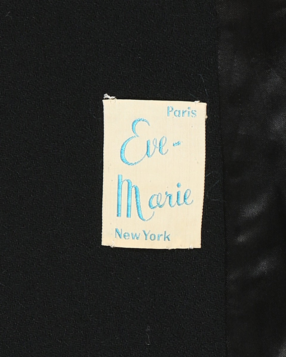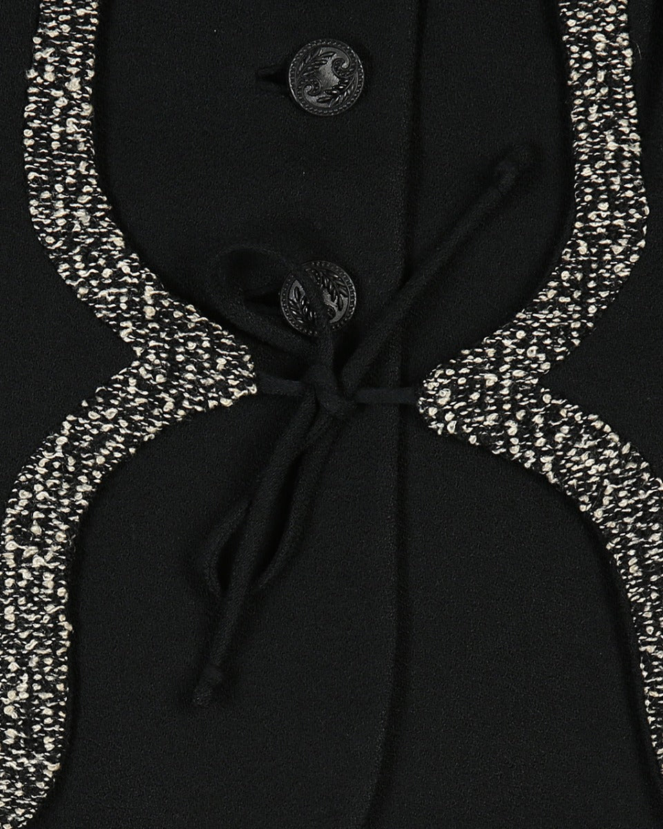 A 1940s black wool crepe and monochrome bouclé jacket from Eve-Marie. The jacket fastens at the front with decorative buttons and a fabric tie which cinches in the waist creating a beautiful silhouette. The silhouette is further enhanced by the use of the boucle detailing which maps the curves of the body. The tipped collar is a unique shape with rounded notches creating two points on each side. A truly impeccable piece of 1940s tailoring.