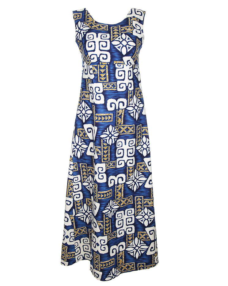 1970's Blue Patterned Hawaiian Sleeveless Maxi Dress - S