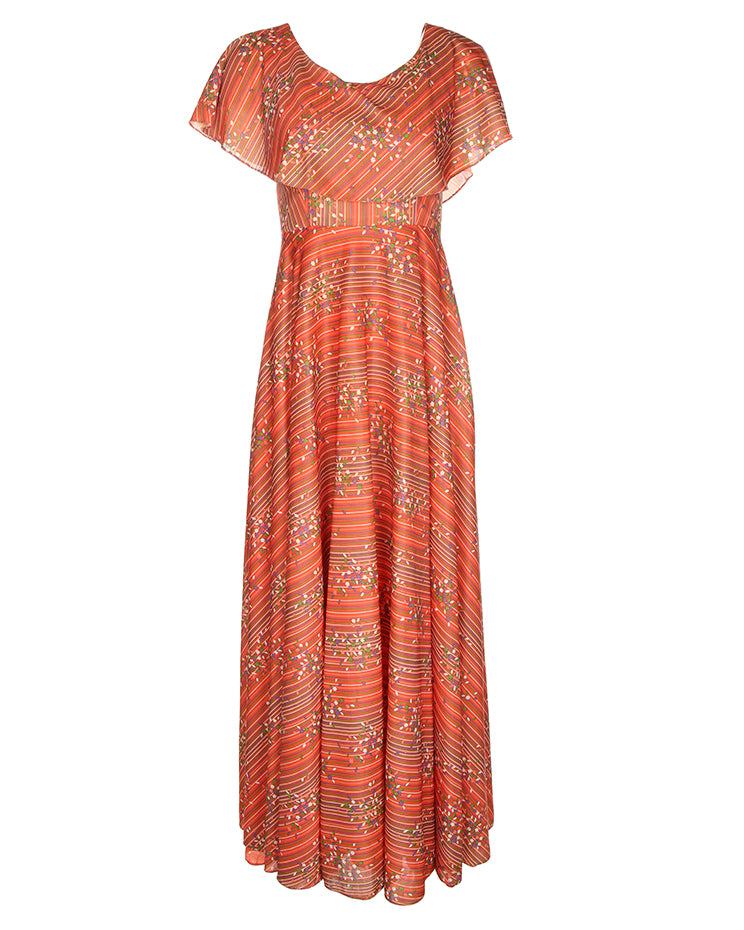 1970's Orange And Blue Striped And Floral Maxi Dress - XS / S
