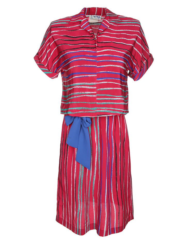 1980's Maroon And Blue Patterned Short Sleeve Dress - M