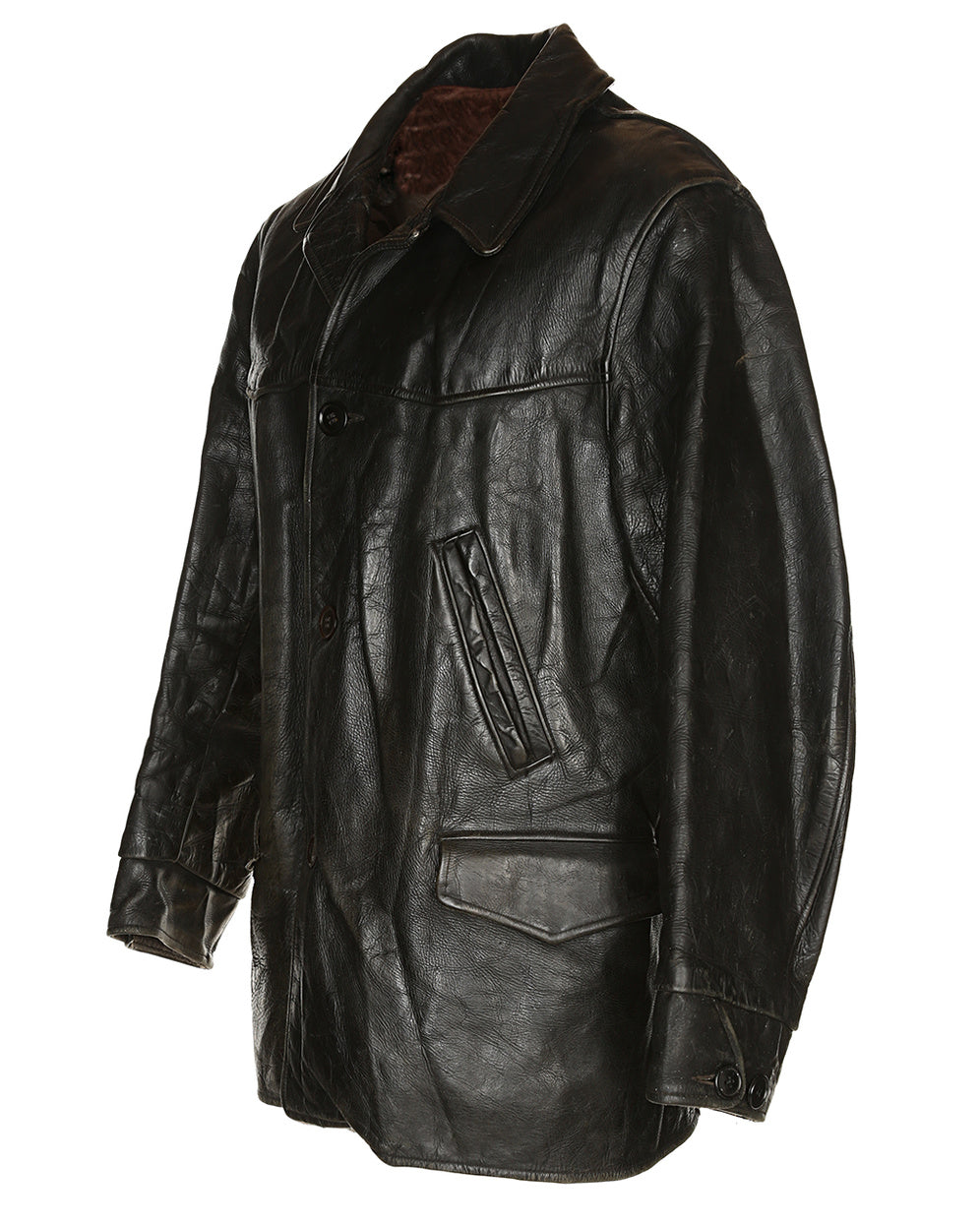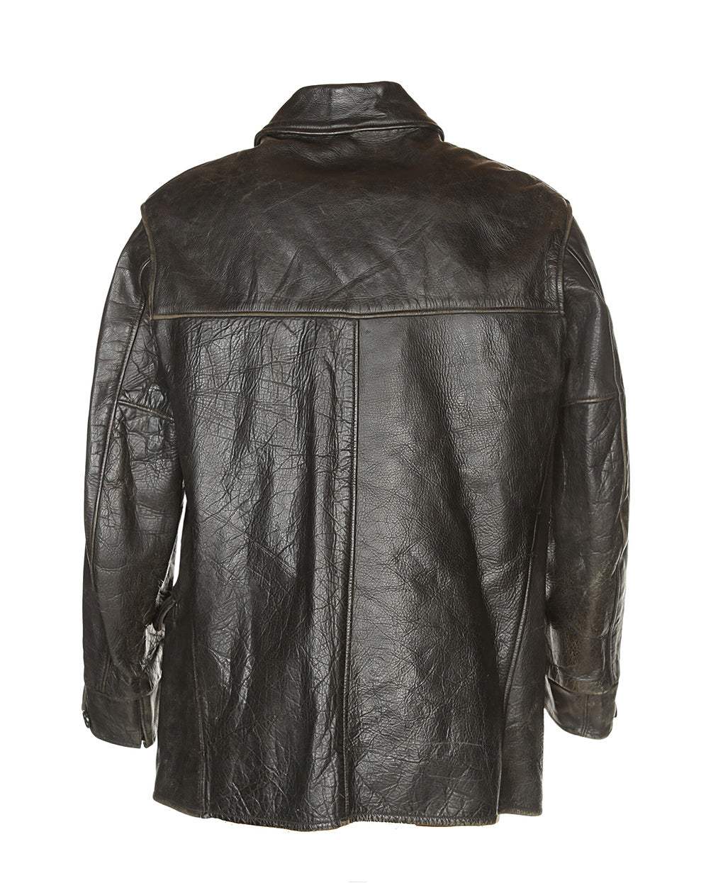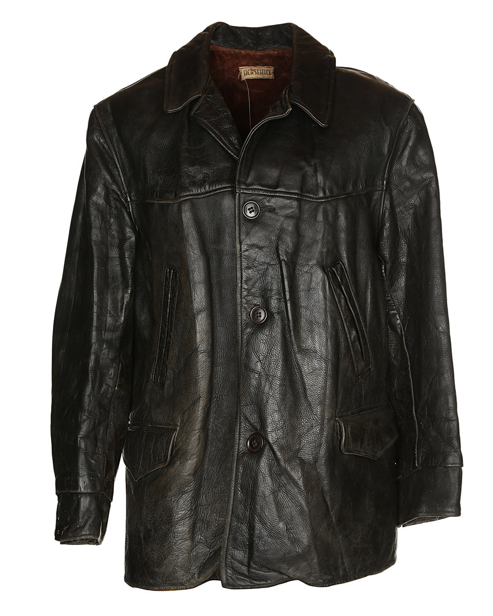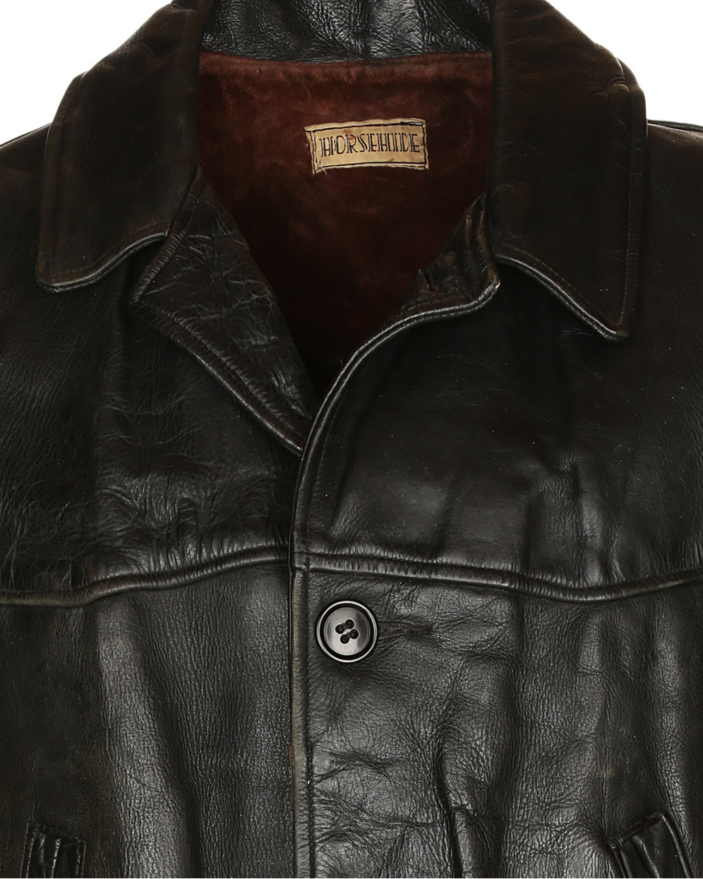 A truly stunning example of a 1930s/40s horsehide leather jacket. In incredible condition, partly due to the high quality and resilience of horsehide, the supple textured leather has aged beautifully. No need to break this stunner in. The jacket has two front welt pockets and two flap pockets directly underneath. It fastens with plastic buttons, has a further two plastic buttons on each cuff and is lined with a textured brown fabric.