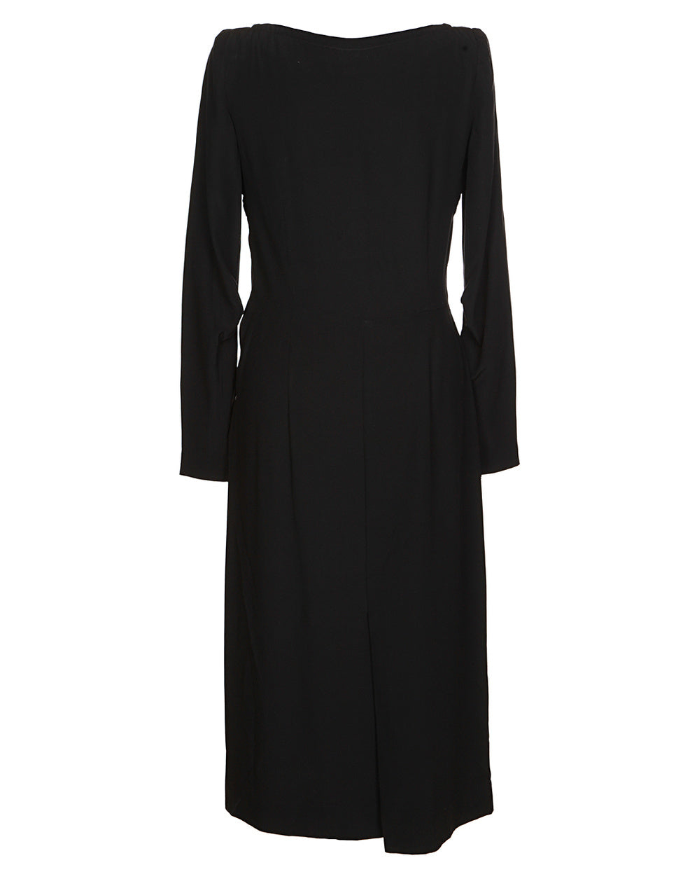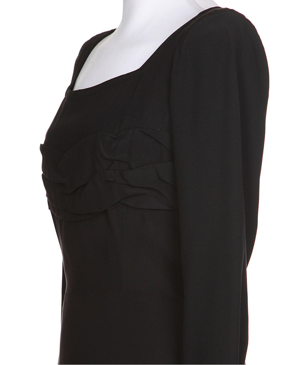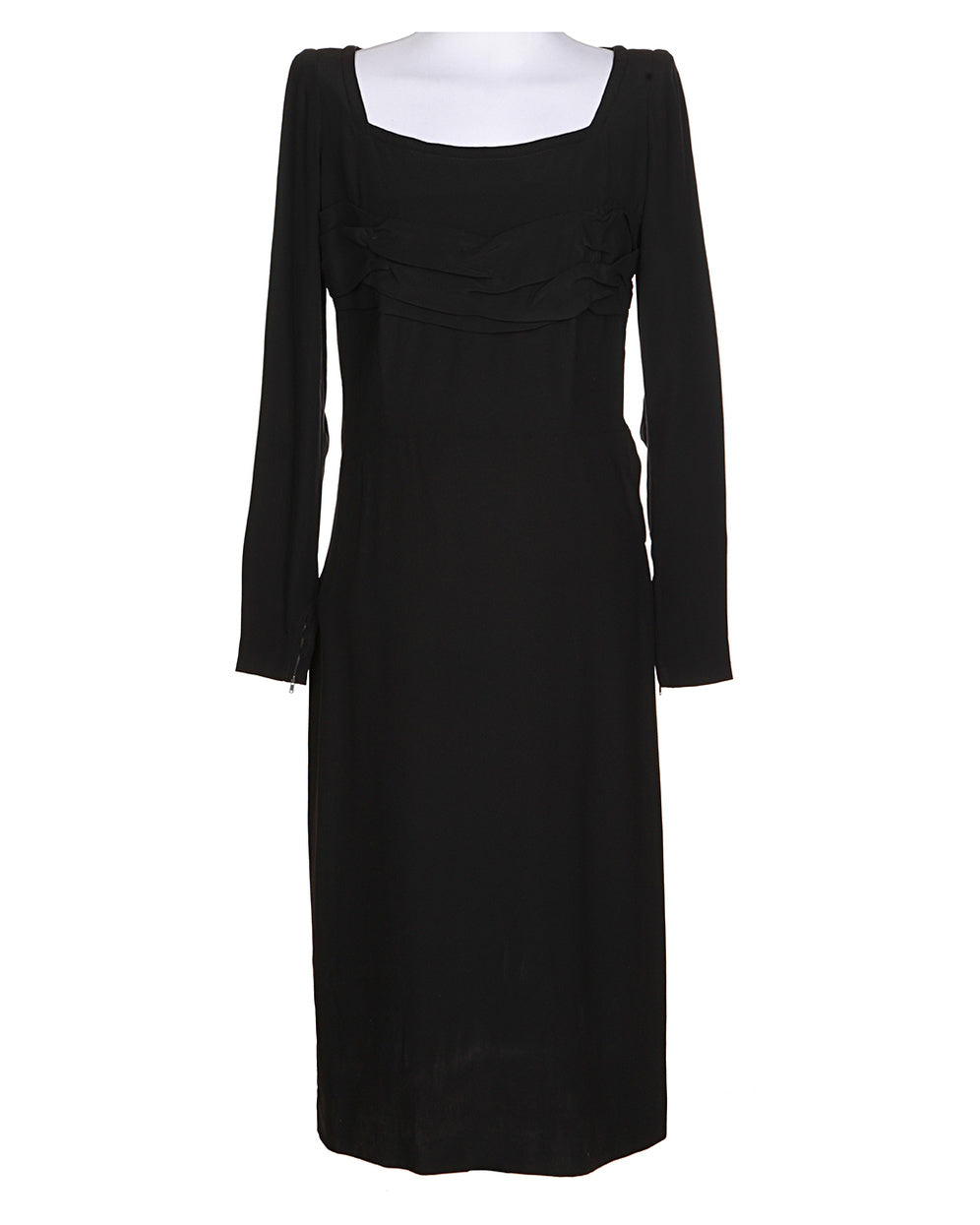 For timeless chic, it's always going to be the ever-elegant black dress. If you want a chance to make this garment a touch more sophisticated than it already has the chance to be, well ofcourse opt for 1940's. This stunningly simple black dress is cut in a modest cut in simple black with a below the knee fall, slim sleeves and a ruffled design across the chest. A wide neckline lends itself perfect to the addition of a striking necklace, otherwise this vintage classic has the power to speak for itself, simply finish with suede heels and a red lip to make it pop. In very good condition.