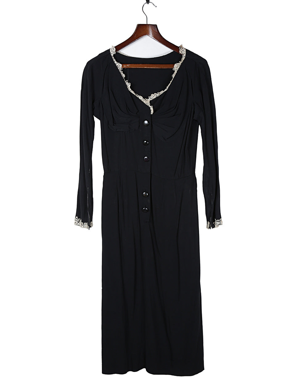 Black 40s dress with cream crochet details on bust and cuffs. The dress features a defined waist, ruching at the bust, buttons down the front and side pockets. This vintage gem is in good second-hand condition but the dress does have a small hole (pictured) and some shine marks.