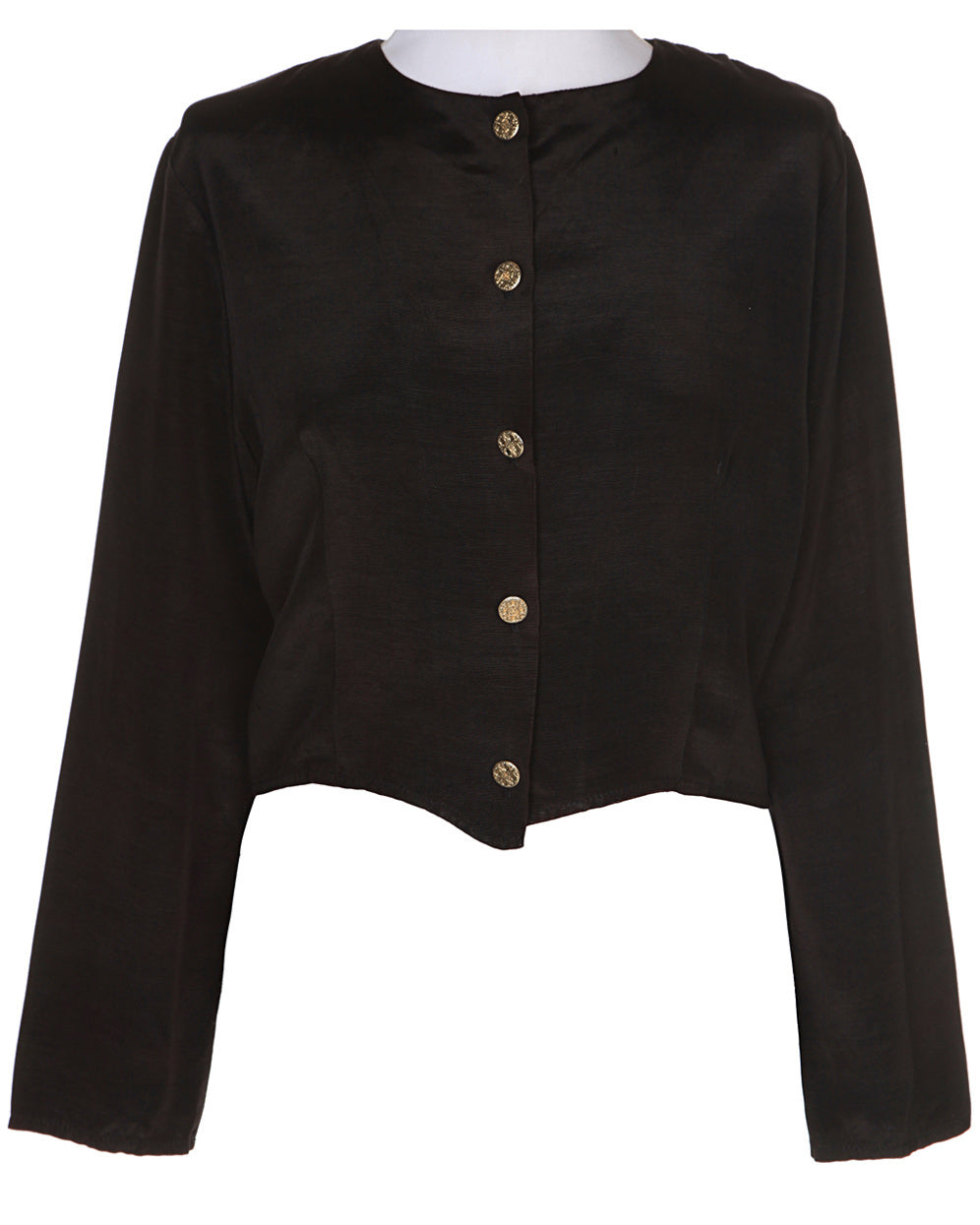 Finish of that special evening look with this sophisticated black gabardine jacket. The cropped design comes with a classic crew cut neck, long sleeves and fitted body. The hem sins from side seam into a low point at the centre front and the piece fasten with gleaming gold-toned buttons. In good condition.