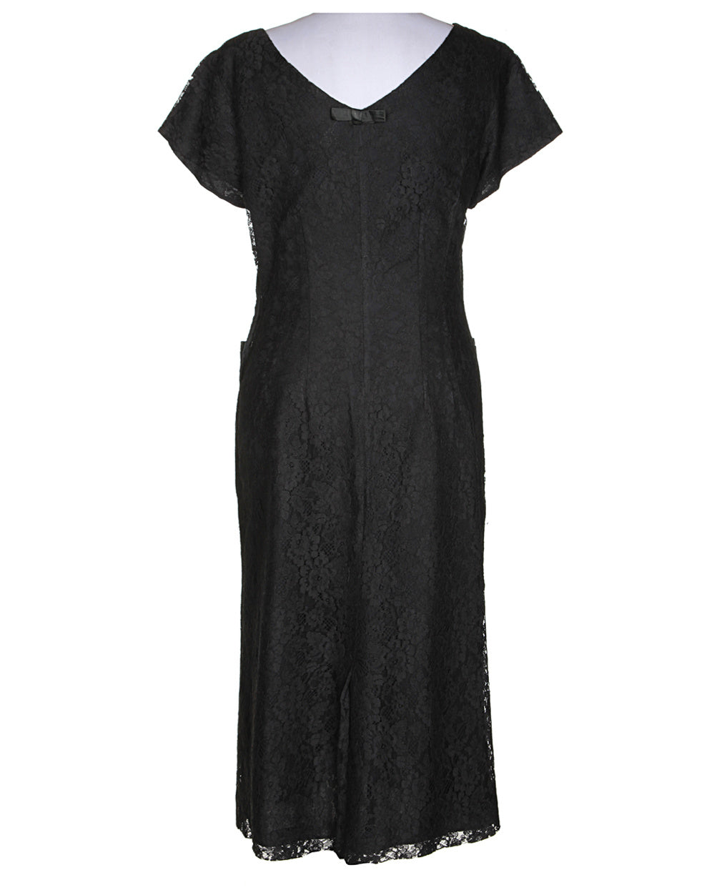 'You can wear black at any time. You can wear it at any age. You may wear it for almost any occasion', Christian Dior knew what he was talking about when it came to everyone favourite colour. Mysterious and stylish, try on this beautiful 1950's lace dress for a look that will turn heads. The authentic vintage design comes in a flattering A-line cut with cropped sleeves, open mouth pockets, scalloped neckline and side fastening. Give a simplistic finish with black heels and a statement necklace. In very good condition.