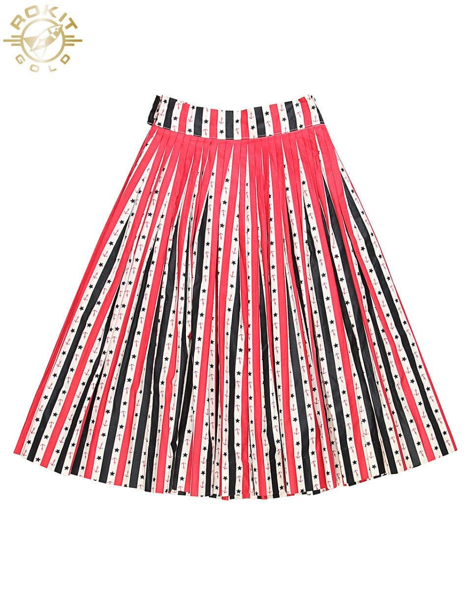 1950s novelty print pleated circle skirt with a star, anchor and stripe pattern.