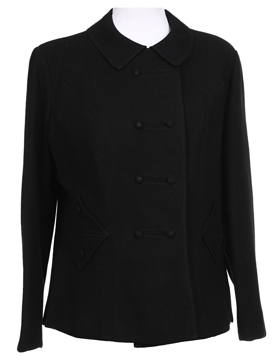 Smart black 1960s long sleeved jacket. A stylish and timeless piece, with its unusual double-button detail front closure, pointed peter pan collar, two small side splits and full lining. Team with breton stripes and cigarette trousers for a modern twist on an old classic!