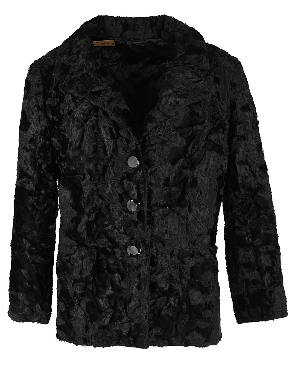 A beautiful 60s black faux fur jacket with collar. The jacket fastens up the front with three black plastic buttons and has two fake flap pockets on the front. This is a timeless piece that will go with any outfit for any occasion, so add some texture to your wardrobe now.
