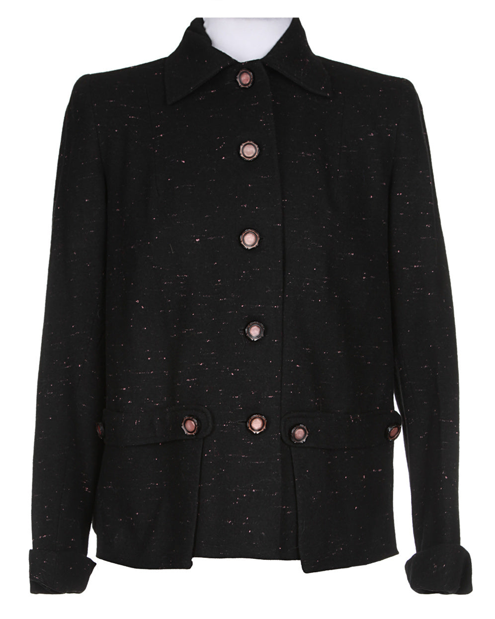 A 60s black tweed jacket with a pink flecked pattern. The jacket fastens up the front with four pink buttons and has two statement pockets on the front.