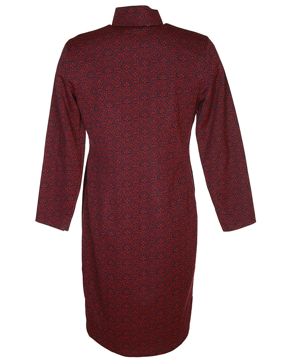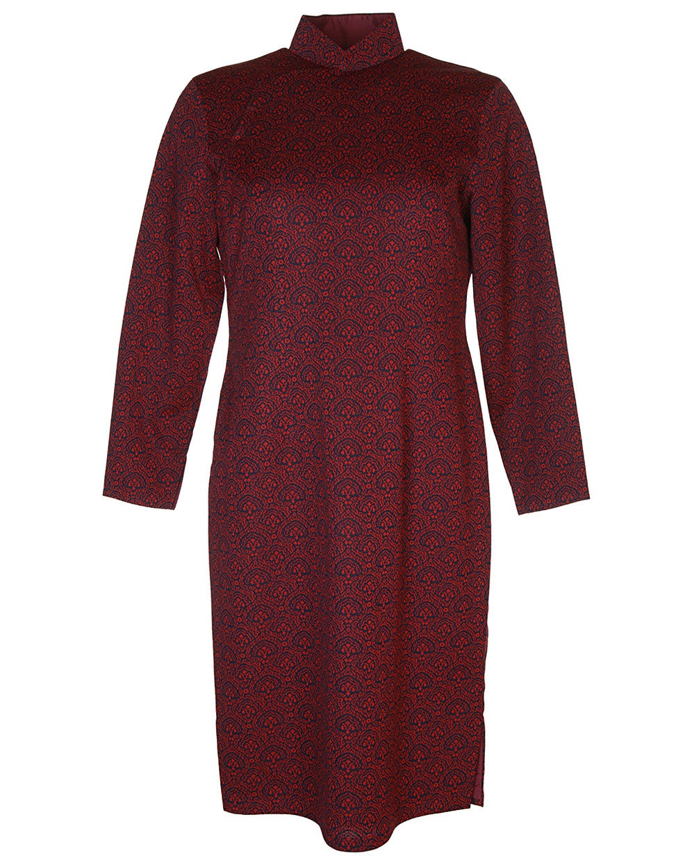 A red and blue patterned cheongsam dress dating from the 1960s. The dress fastens at the front with a metal popper panel that cuts across the bust and a side metal zip. The dress features long sleeves, a Mandarin collar and is fully lined with a silky fabric.