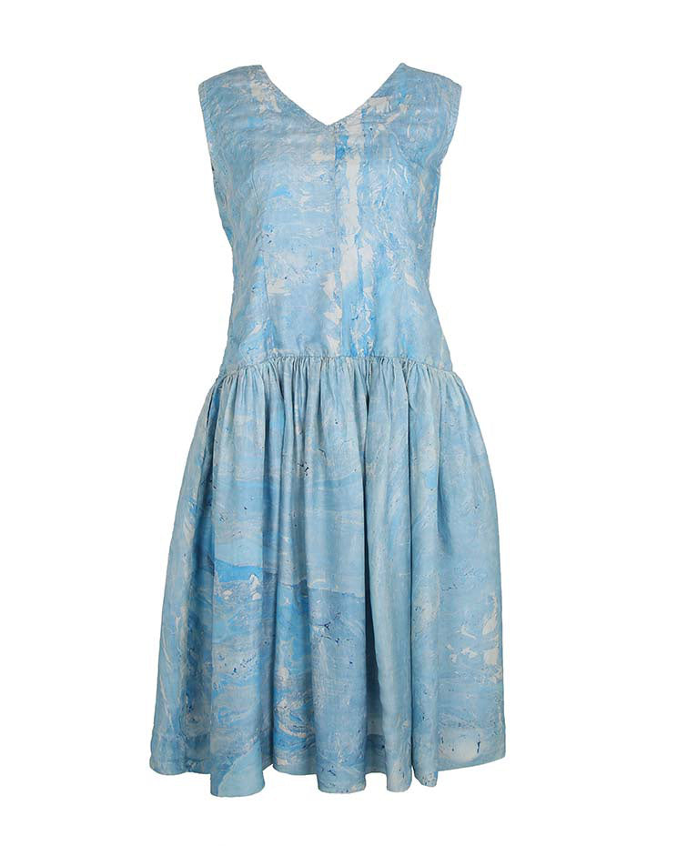 A delicate blue silk dress dating from the 1960s with a painterly abstract print. The dress features a v-neckline, a full skirt with a ruched waistband and a small hook-and-eye side opening.