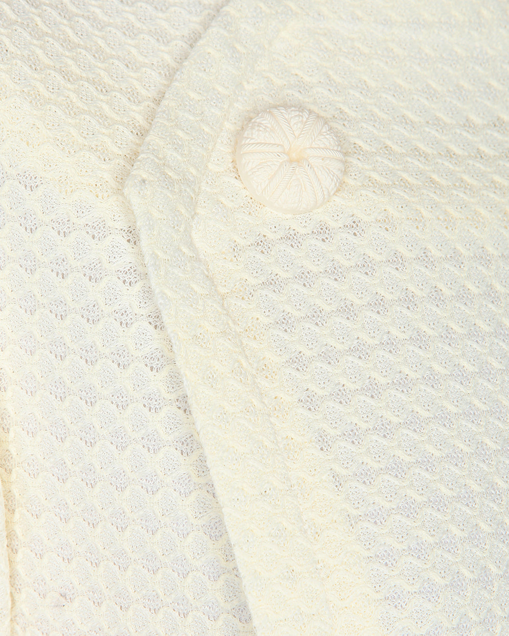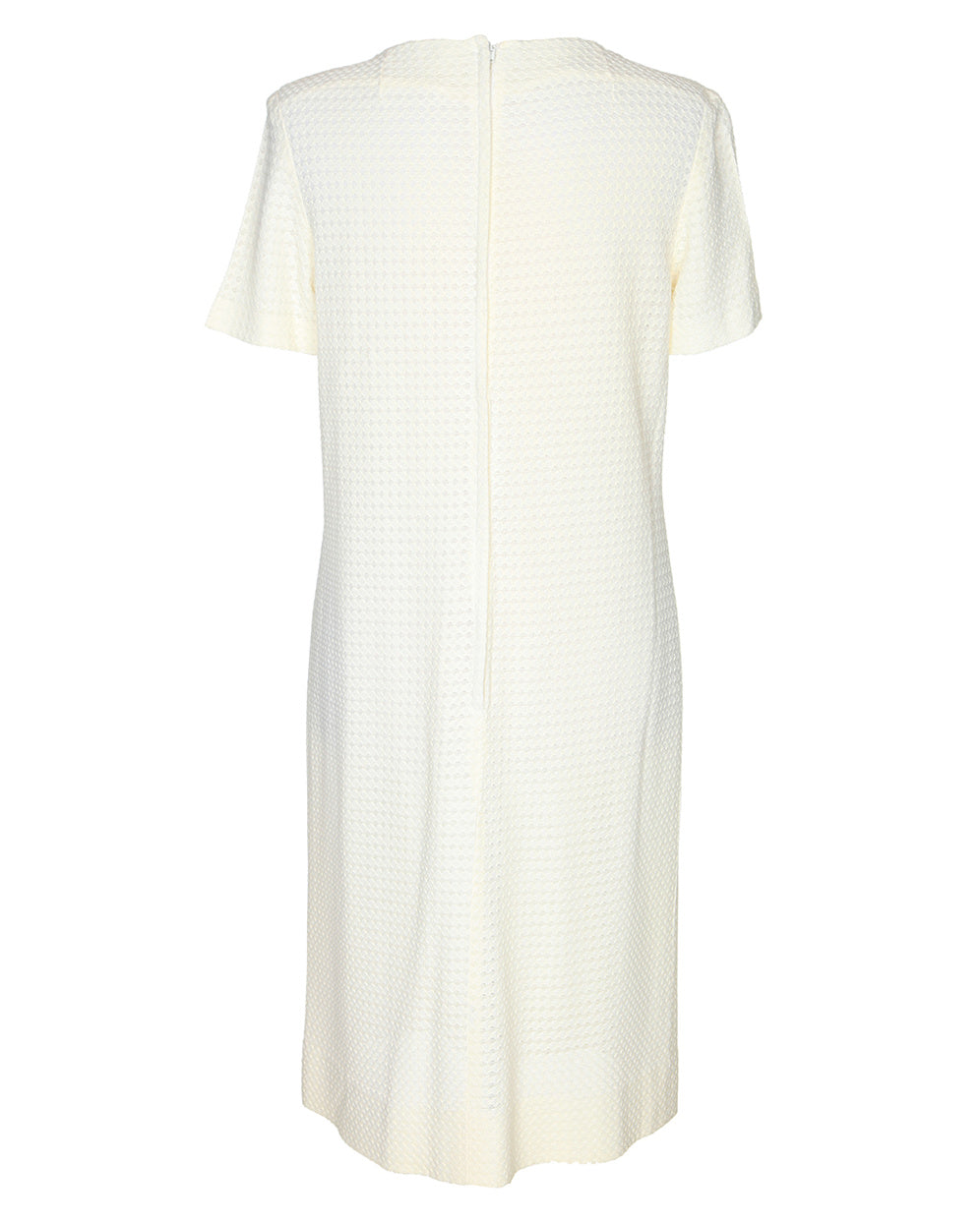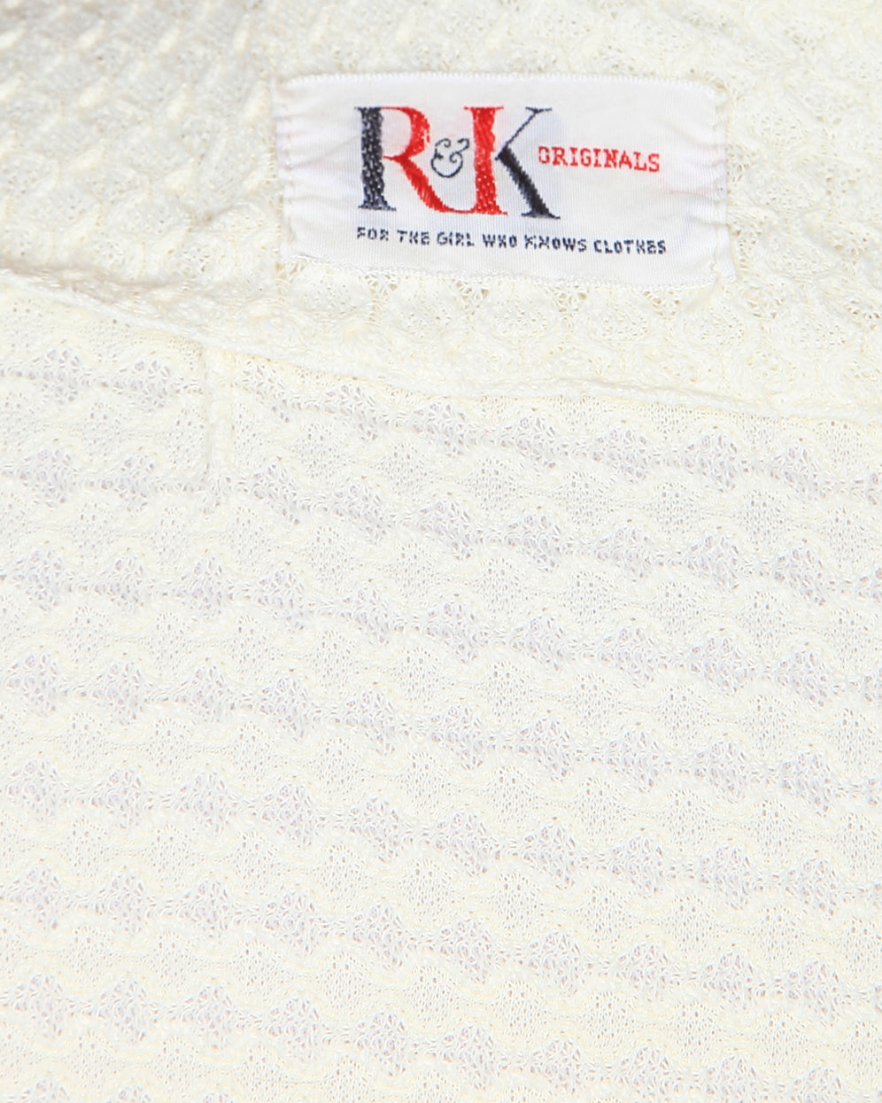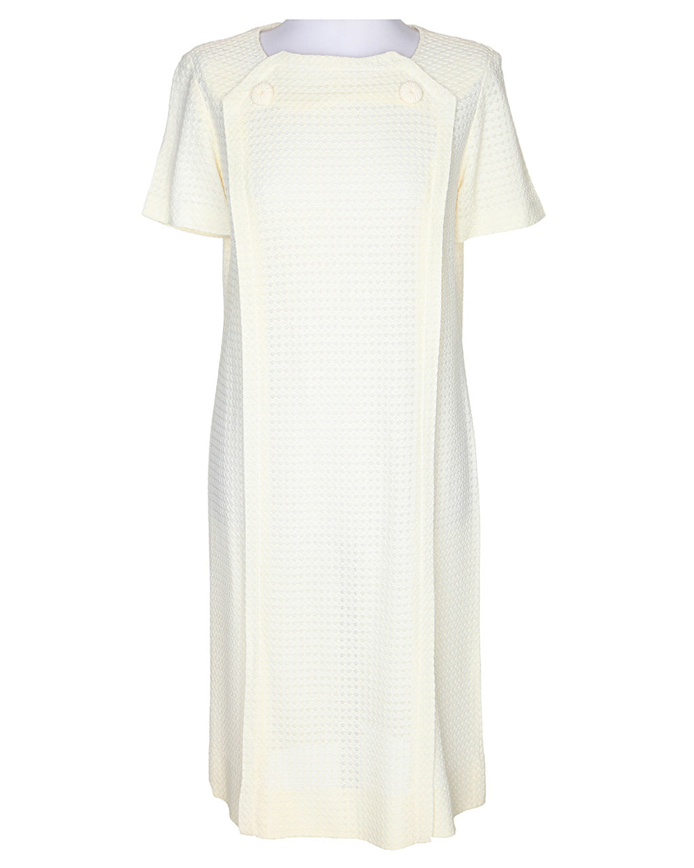 Beautifully simple original 1970s day dress. The cream cotton base is woven with a slight horizontal waved pattern, with crew neck and short sleeves, the mini-midi length (depending on height) makes this the ultimate smart-casual dress. The raised panel running the full length of the dress gives a layered effect, with 2 large white plastic buttons seemingly holding the panel in place. For a dress of this age and colour, it is in excellent vintage condition. The label inside reads R&K Originals.