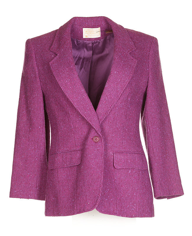 A gorgeous 70s Pendleton purple tweed blazer. The jacket fastens at the front with a single plastic button and features two front pockets. Add a touch of colour to your wardrobe with this bold piece. Style with a white turtleneck and jeans for a cool smart look.