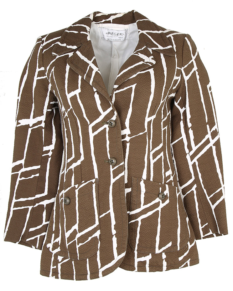1980s brown patterned slim seersucker blazer jacket from British boutique Jaeger.