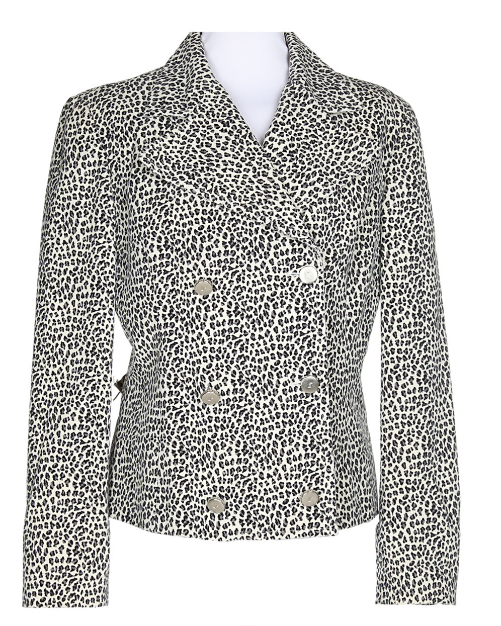 90s Gianfranco Ferre double-breasted velvet jacket with an animal print design. Features notched collar and silver buttons. In excellent condition.
