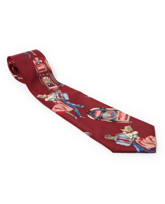 For a kick of character, get bold with your tie selection. This red 90s design features swing dancing couple and coca-cola adorned junk boxes for a nostalgic feel. In very good condition.