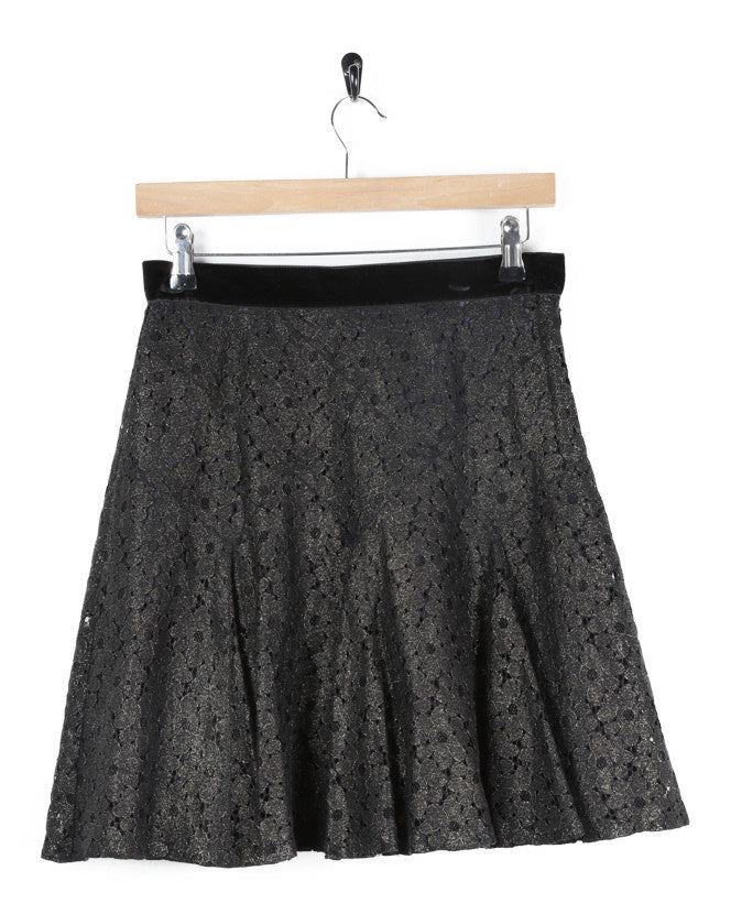 A black and gold floral lace skater skirt by American fashion designer, Anna Sui. Featuring a black velvet waistband, this piece will look great paired with a white blouse for an evening out.