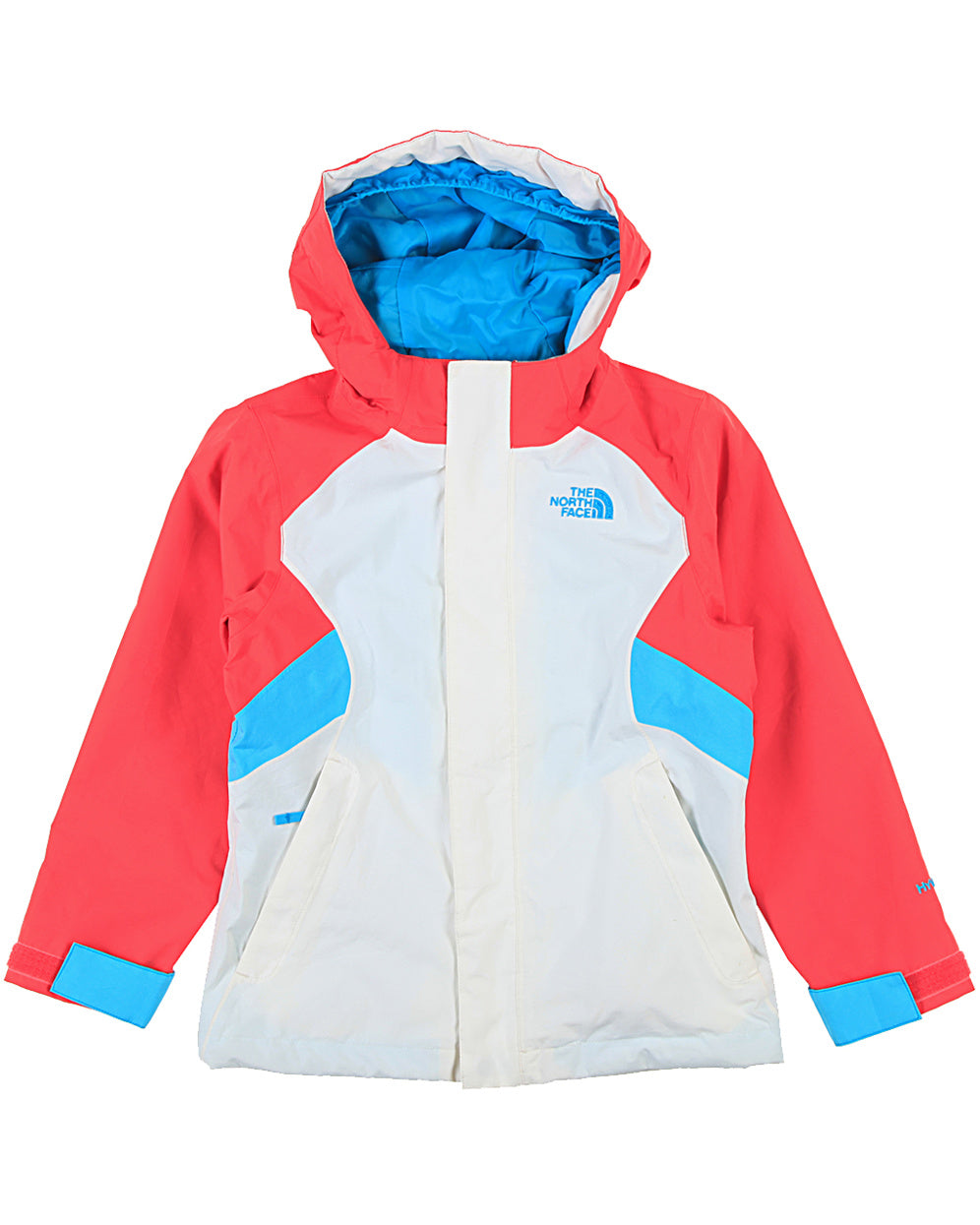 Brighten up a rainy day with this white waterproof design from Northface. The utilitarian childrens piece features a bold contrasting pink and blue panelling design. Welt style zip fastening pockets are built in and hood features an elasticated storm proof design. Cuff tightens via Velcro and ownership tag is attached at the inside lining. This piece is in good condition.