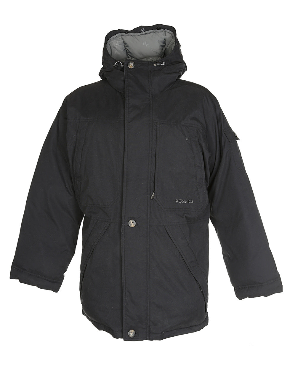 A Columbia black ski jacket with hood and multiple pockets. This jacket is lined with down, keeping you super warm on the slopes so you can concentrate on enjoying yourself! Also a great coat for city living in the depths of winter.