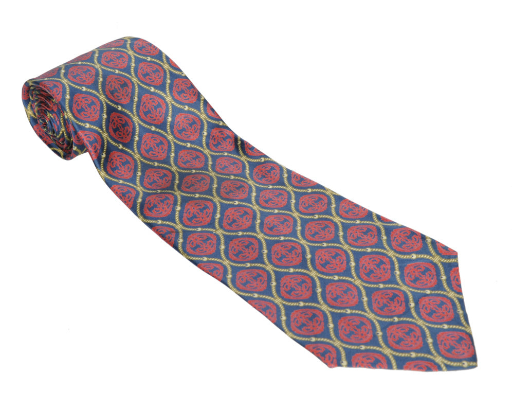 Blue and red patterned tie, made from silk from Harrods. This tie pattern is adapted from the embroidery of a dress worn by Elizabeth I.
