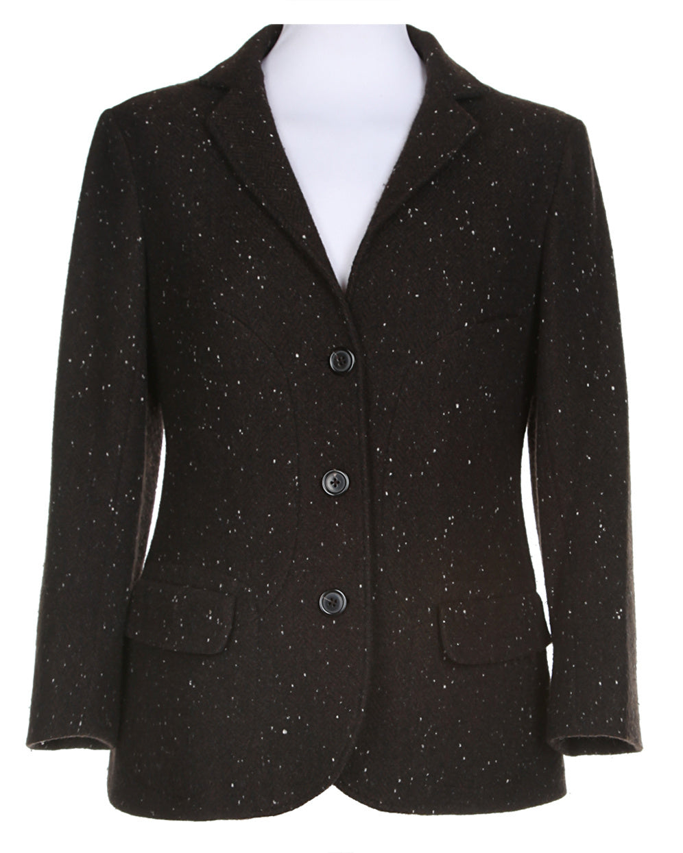 Classic Jil Sander black speckled tweed jacket with notched collar. Features three buttons at the centre and two pockets. An elegant piece for both smart and casual wear, this is a true investment and could be worn for years to come. Made from a cashmere and wool mix. In excellent vintage condition.
