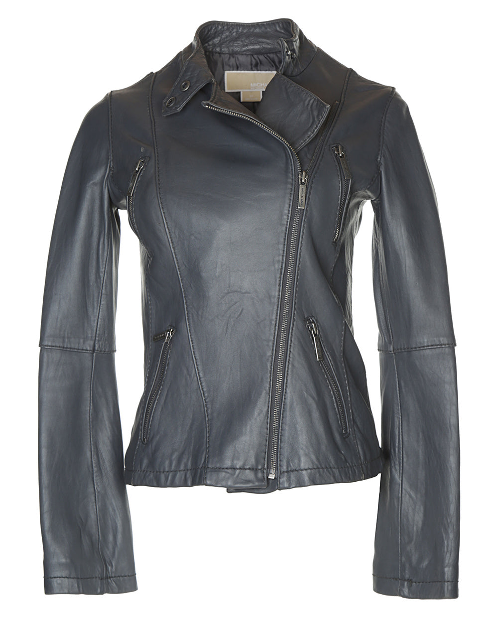 A luxurious buttery soft grey leather biker jacket from designer label Michael Michael Kors. The jacket fastens at the front with an asymmetrical metal zip and has four front zip pockets. The collar fastens with two poppers and there is a fan detailing on the back of the jacket. The jacket is lined with a grey silky fabric.
