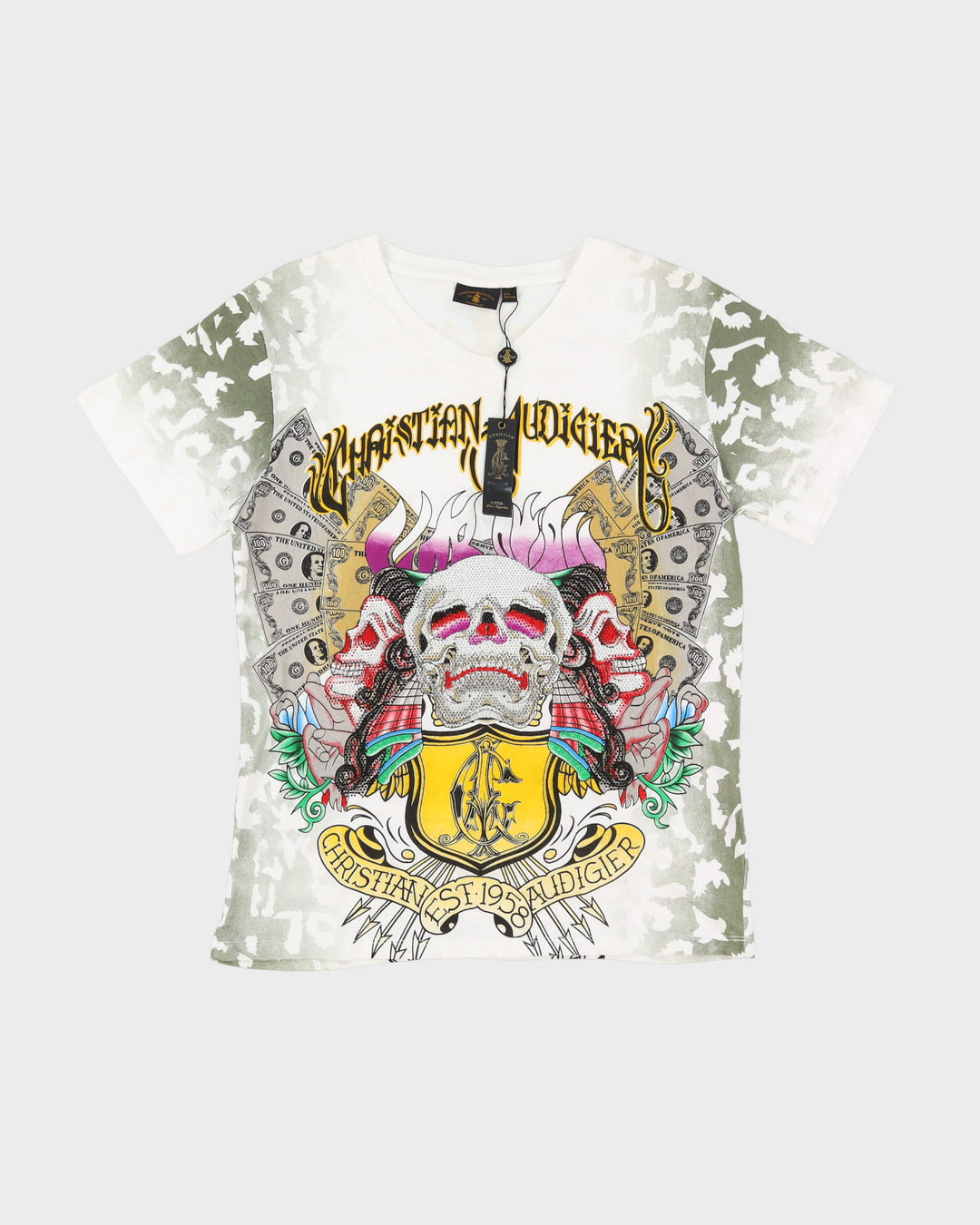 New With Tags Christian Audgier Ed Hardy Style All Over Print White / Multi Coloured T-Shirt - M
