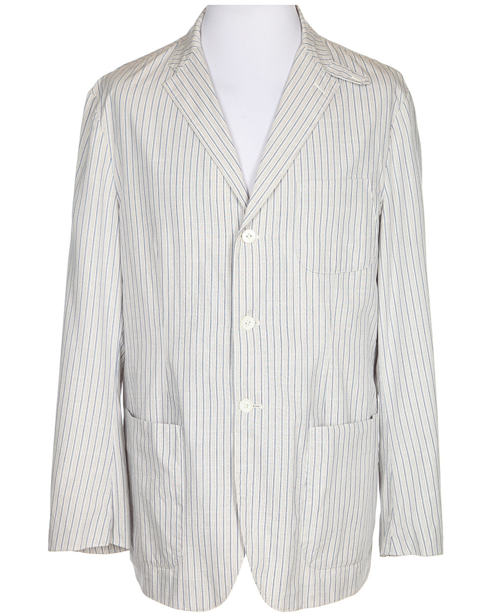 A blue and white striped jacket from Polo by Ralph Lauren.The blazer fastens up the front with three pearl-esque buttons and has three pockets on the front.