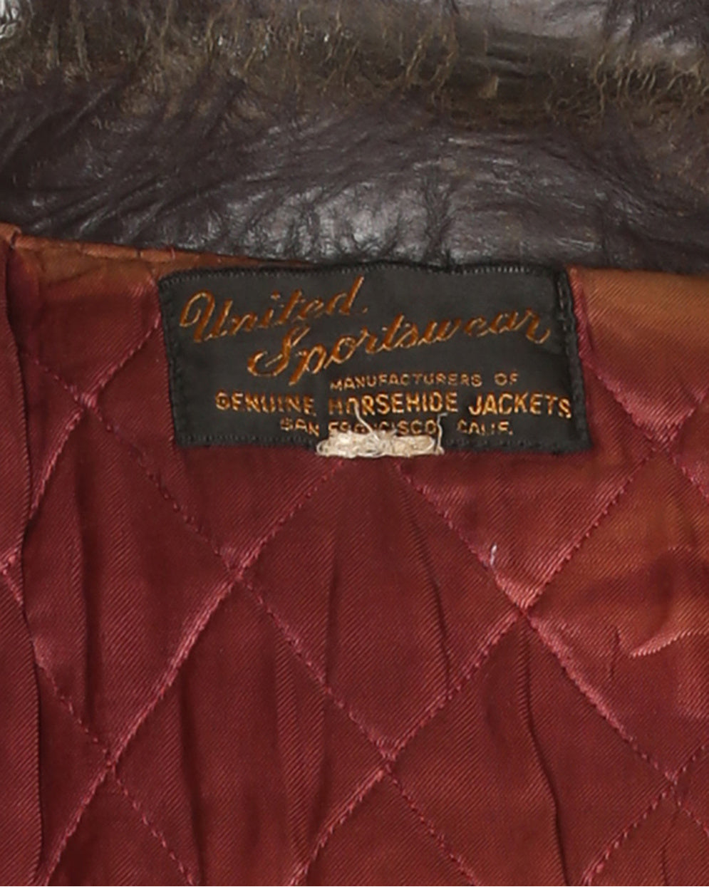This gorgeous and rare piece dates all the way back to the 1940s. Made from horsehide leather of the finest quality and lined with silk, this flight jacket is a truly remarkable collector's item. Made by the company United Sportswear, hailing from San Francisco, California, this item embodies the all American spirit of a quality vintage leather jacket.