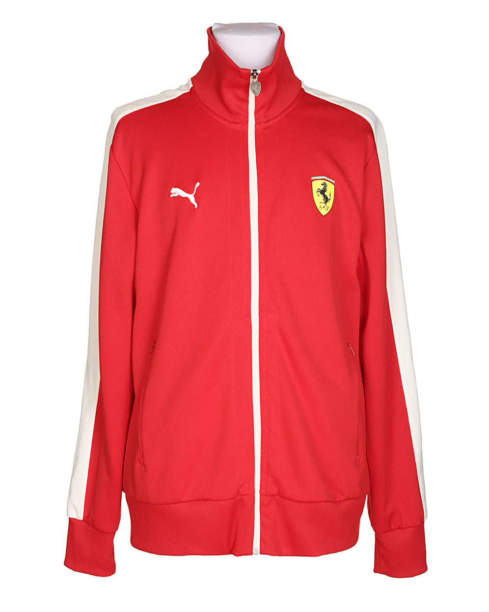 Stand out on this red Puma for Ferrari track jacket. Full zip front wth Ferrari logo zip detail and Puma and Ferrari logos on the front. Jacket features white stripes down each sleeve, two zip-up front pockets and Ferrari ghost logo on the back of the jacket with Italian flag embroidery just below the back of the neck.