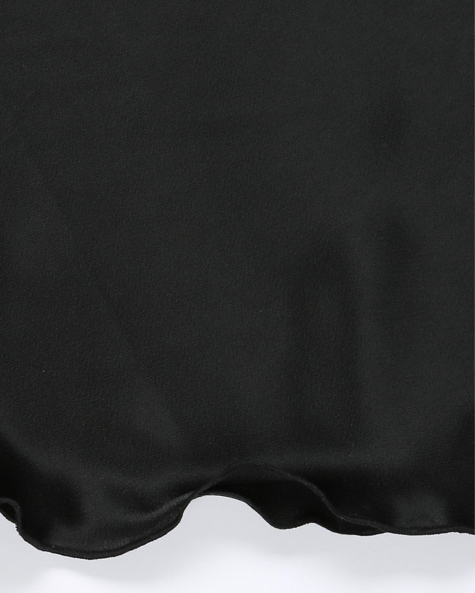 This one is a classic satin black made of a mediumweight fabric. Check our size chart for more information on the measurements.