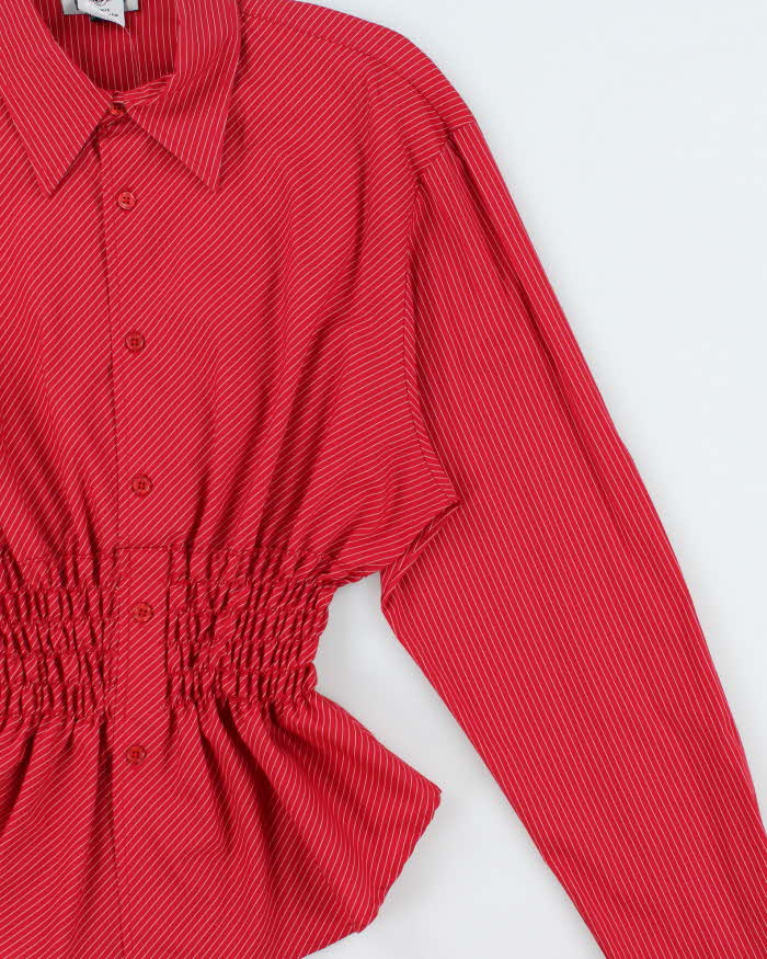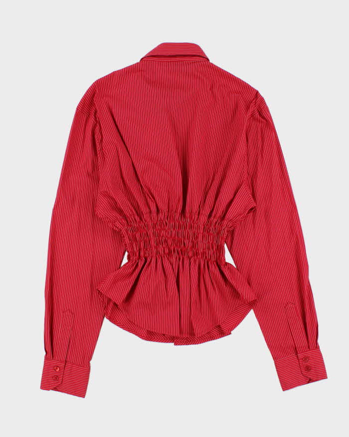 Carefully selected quality shirts are fitted to the body by shirring them at the waist. The button stand is sewn shut so the shirt acts like a t-shirt.