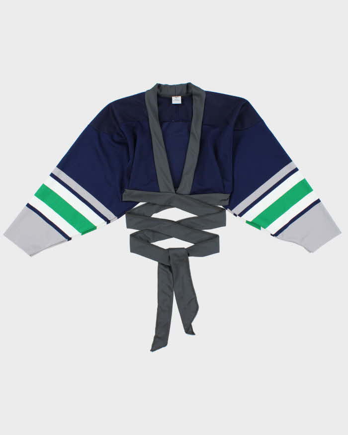 Cropped and fitted, these tops are upcycled from NHL and other sports jerseys. A kimono collar and wrap belt have been added from deadstock fabrics to style the garment after a ballet cardigan; the waist belt is long enough to wrap around your waist twice and knot at the front. This is the perfect addition to your summer wardrobe and festival outfits.