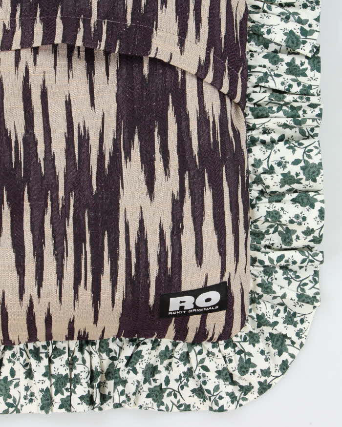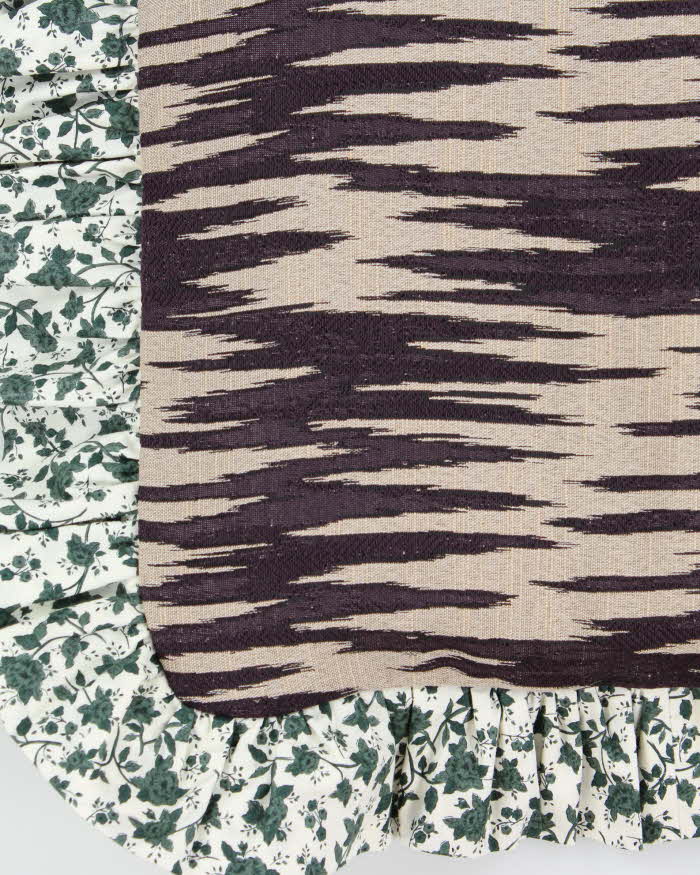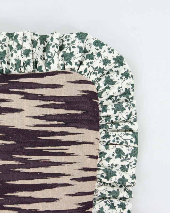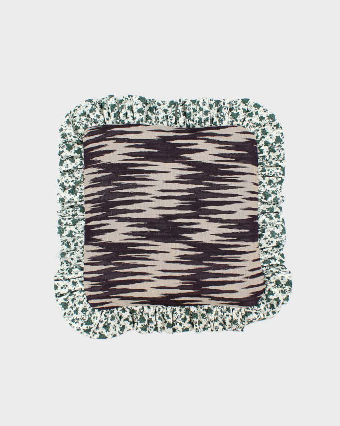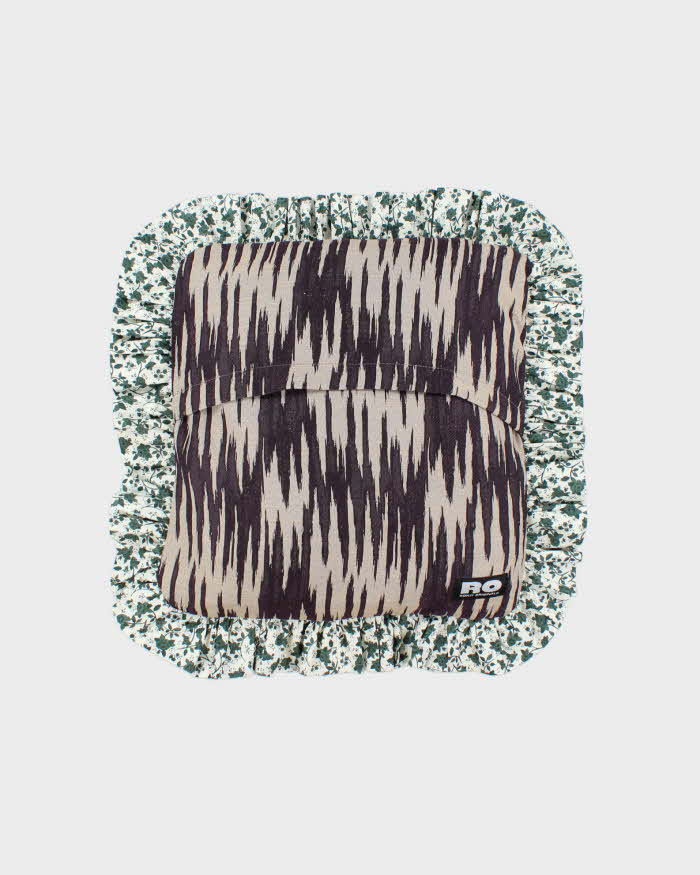 Cushion covers are made from a mixture of deadstock upholstery, curtains and other fabrics. Some from the excess of the Widely Ernest trousers- why wouldn’t you want a cushion cover to match your trousers??? Frill around the edge is made from deadstock cottons and other textiles. The team have perfectly paired each frill and each cover. This fits a cushion 40x40cm.