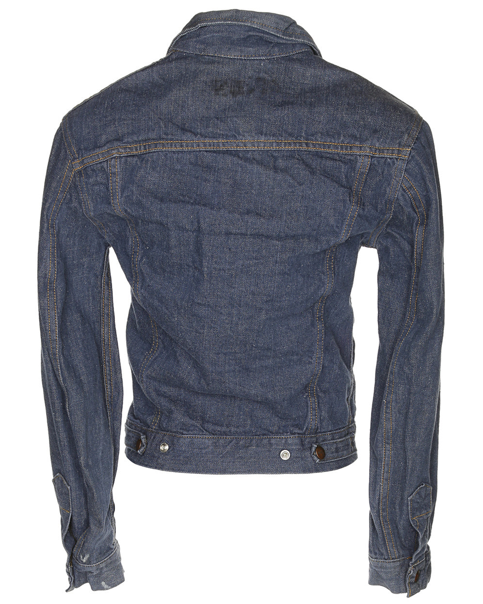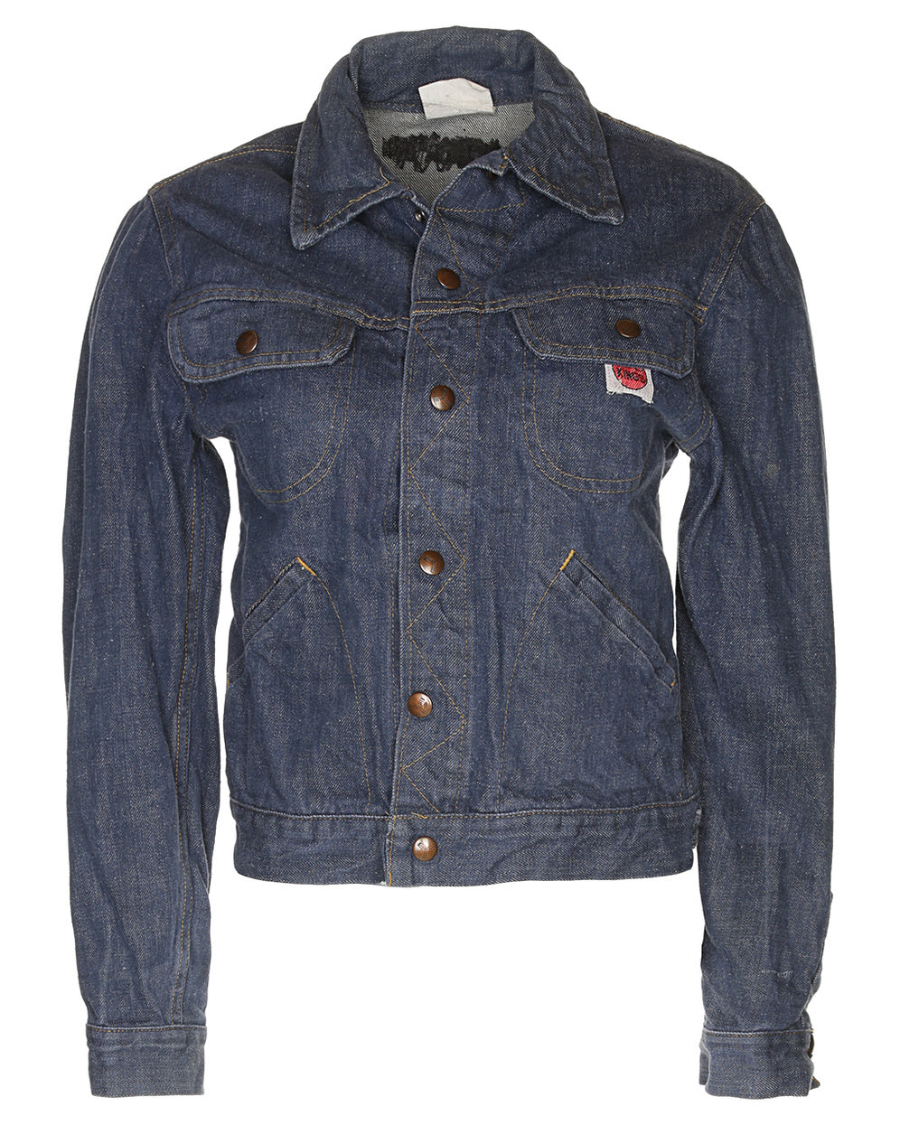Original 1960s GWG denim jacket in a grey-toned mid blue. In a classic boxy-cut shape with tan-coloured stitching, popper closures and bronze-toned hardware. With popper-down cuffs, welt pockets at the hips and secure rounded flap pockets on the chest.