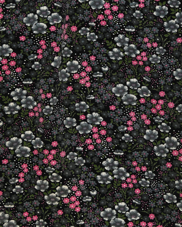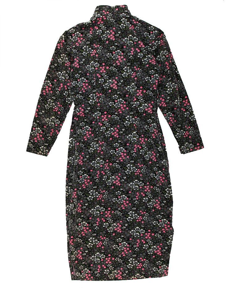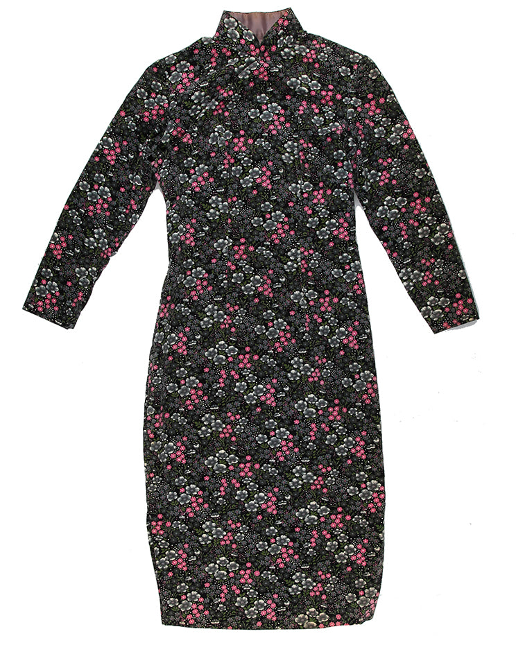 A beautiful velvet 1960s black cheongsam dress with a stunning grey and print floral ditsy print pattern.