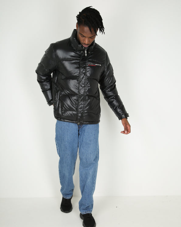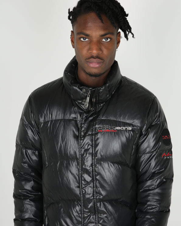 Vintage FUBU puffa jacket in black with concealed zip fastening, two zip pockets, feather down filling and embroidered chest logo.