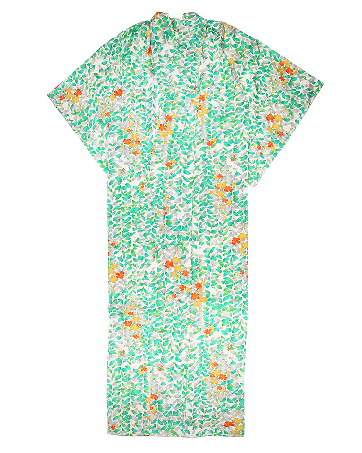 Vintage Green, Orange And White Leaf And Blossoms Patterned Silk Kimono - S / M