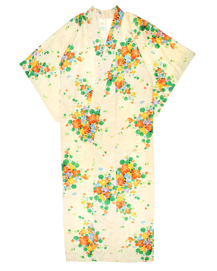 Vintage Green, Orange And Yellow Blossoms Patterned Silk Kimono - M / L
