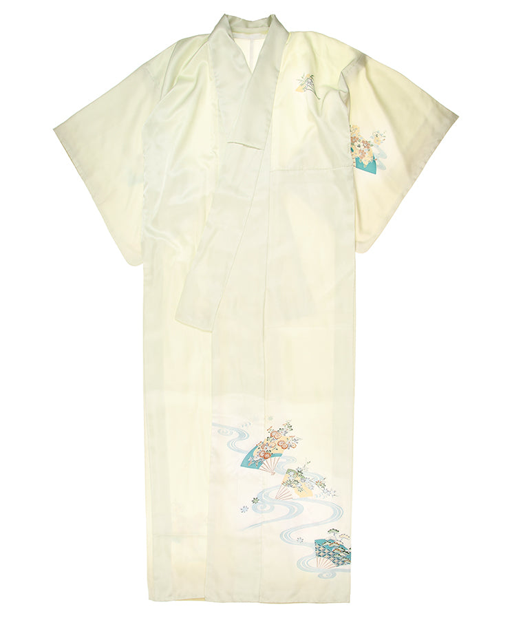 Vintage Lime With Fan Patterned Silk Kimono - M / L
