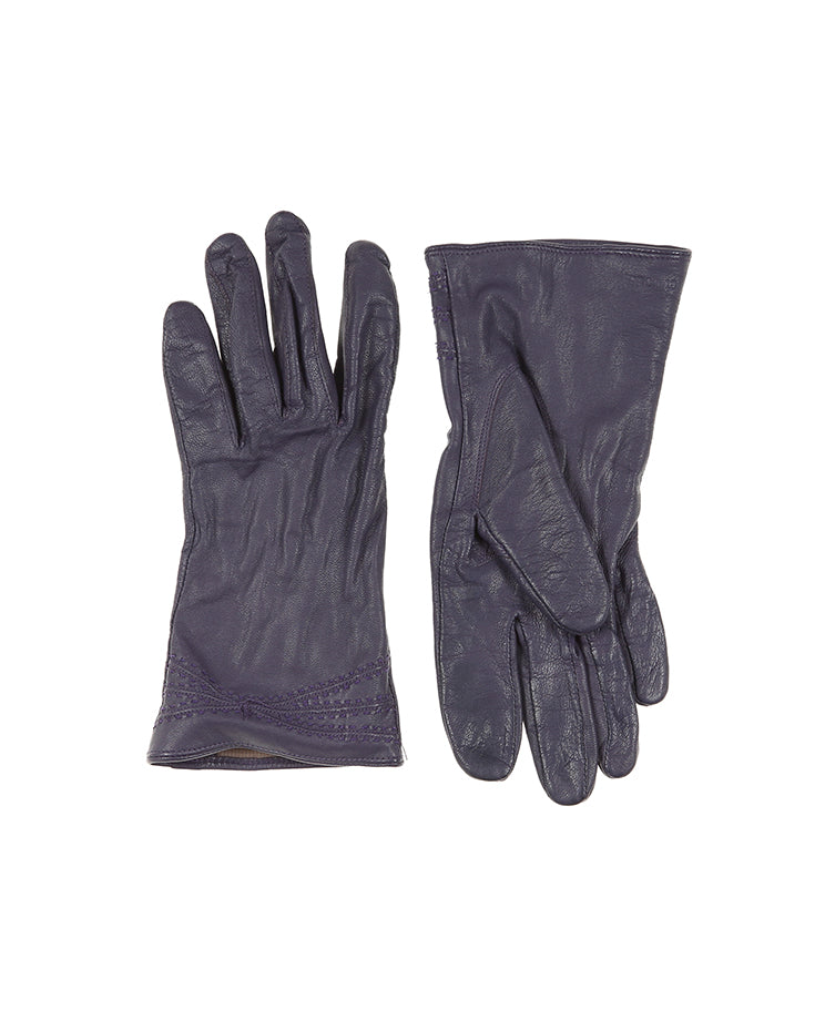 Vintage women's leather gloves in purple with stitch detail running across the wrist.